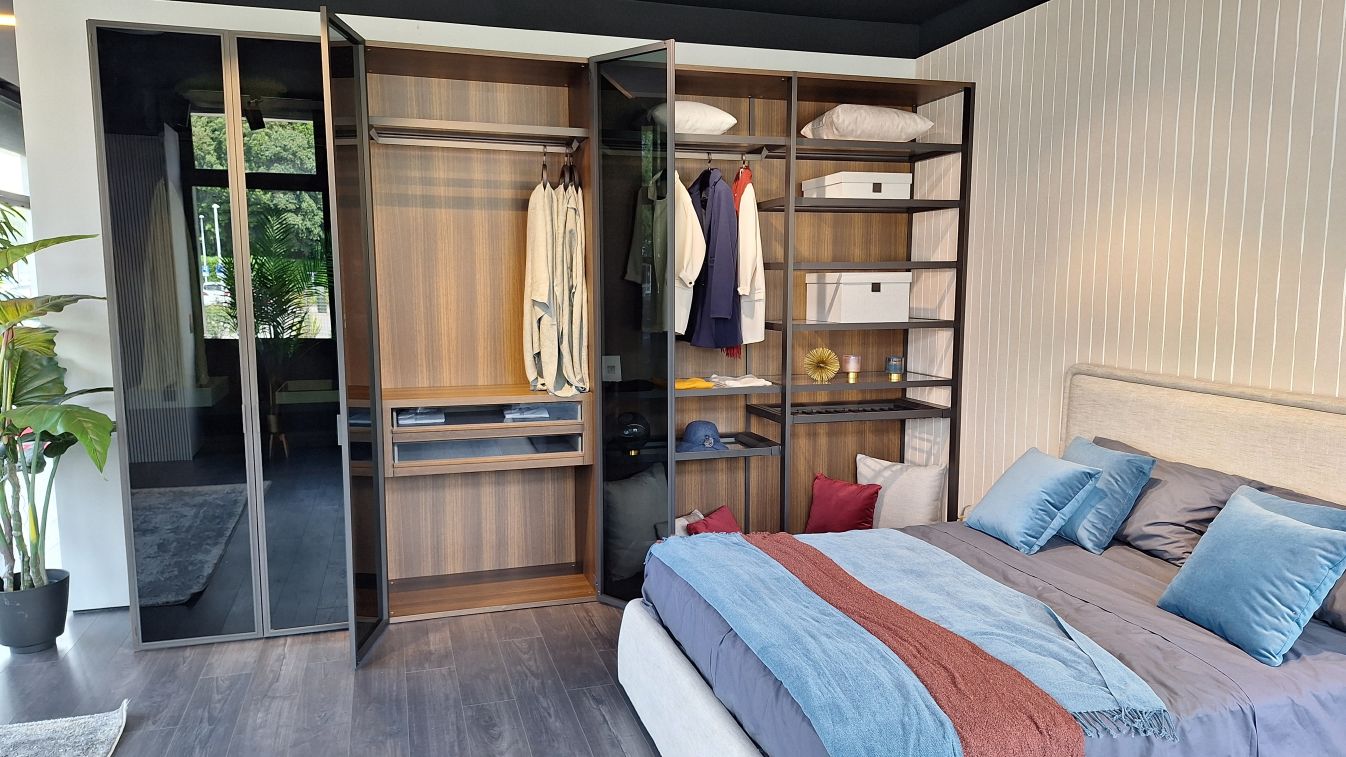 Armadio Aurora: Un design imponente con ante a specchio fumé e dettagli in legno scuro, che unisce stile e un’organizzazione impeccabile grazie a sezioni a giorno e vani chiusi.