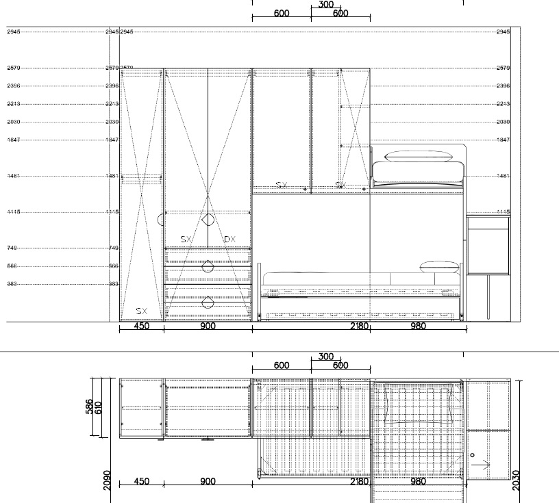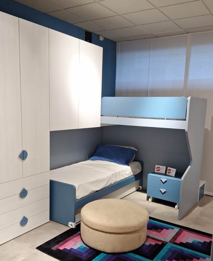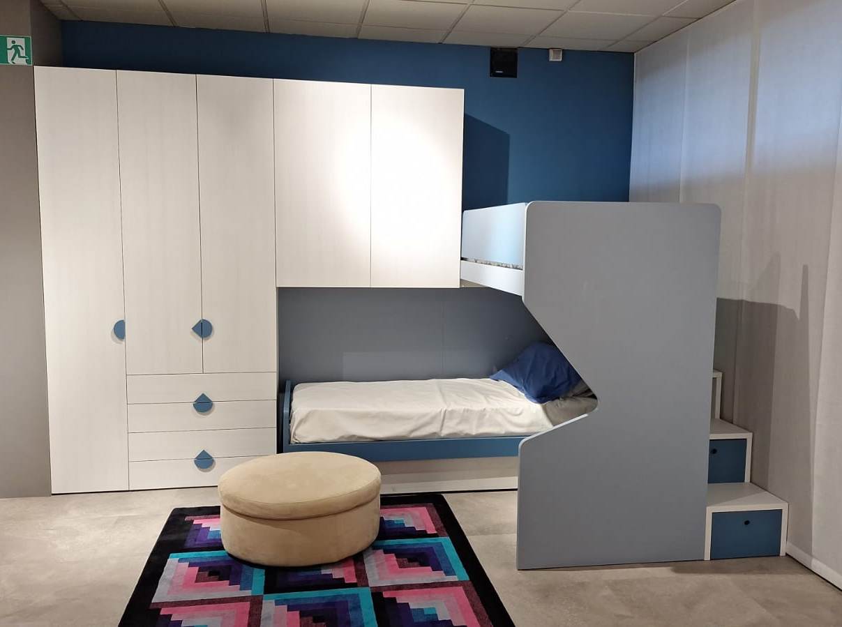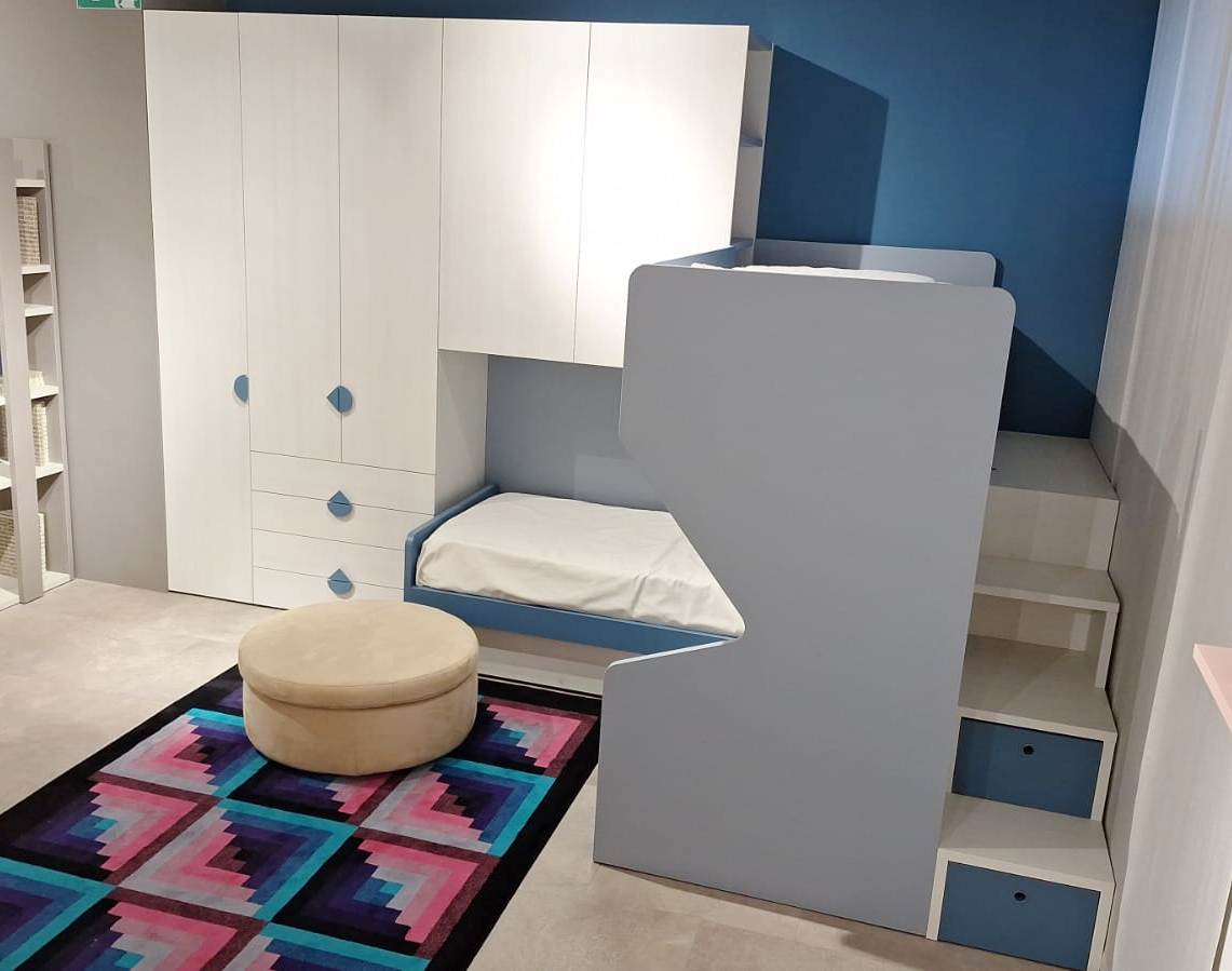 Stupenda camera per ragazzi che permette di sfruttare al meglio gli ampi della cameretta. I 2 letti a castello disposti con soppalco ad angolo sono l’ideale: inoltre la scala a gradoni contenitivi permette un facile accesso anche al letto superiore.