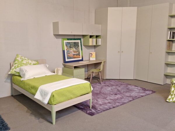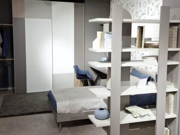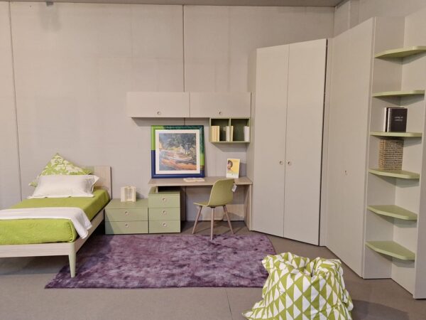 Cameretta con 2 letti singoli per ragazze che volgiono utilizzare appieno il loro spazio, studiando e giocando. La nicchia Nascondino ricavata nell’armadio è infatti utilissima per giocare o utilizzabile anche come angolo relax per leggere serenamente un libro