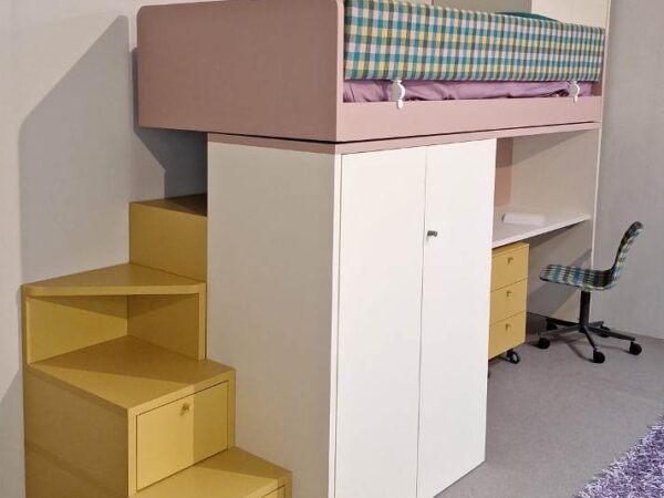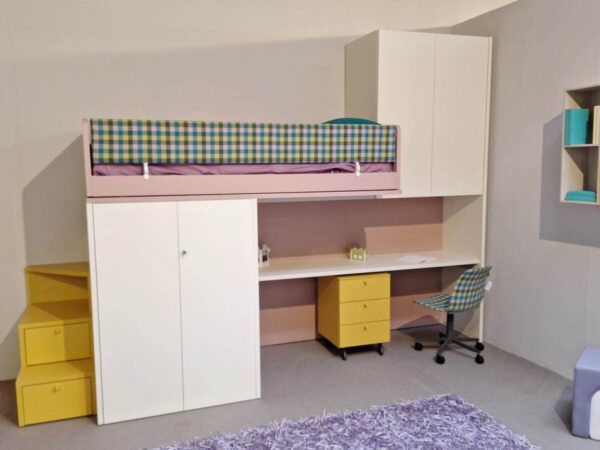 La cameretta Nascondino rosa Pitagora si compone con 2 letti, 2 comodini di cui uno con prese USB e ricarica wireless (disponibile anche con cassa acustica bluetouth), armadio Nascondino, scrittorio e menole casellario portalibri