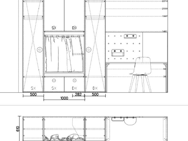 Cameretta con 2 letti singoli per ragazze che volgiono utilizzare appieno il loro spazio, studiando e giocando. La nicchia Nascondino ricavata nell’armadio è infatti utilissima per giocare o utilizzabile anche come angolo relax per leggere serenamente un libro