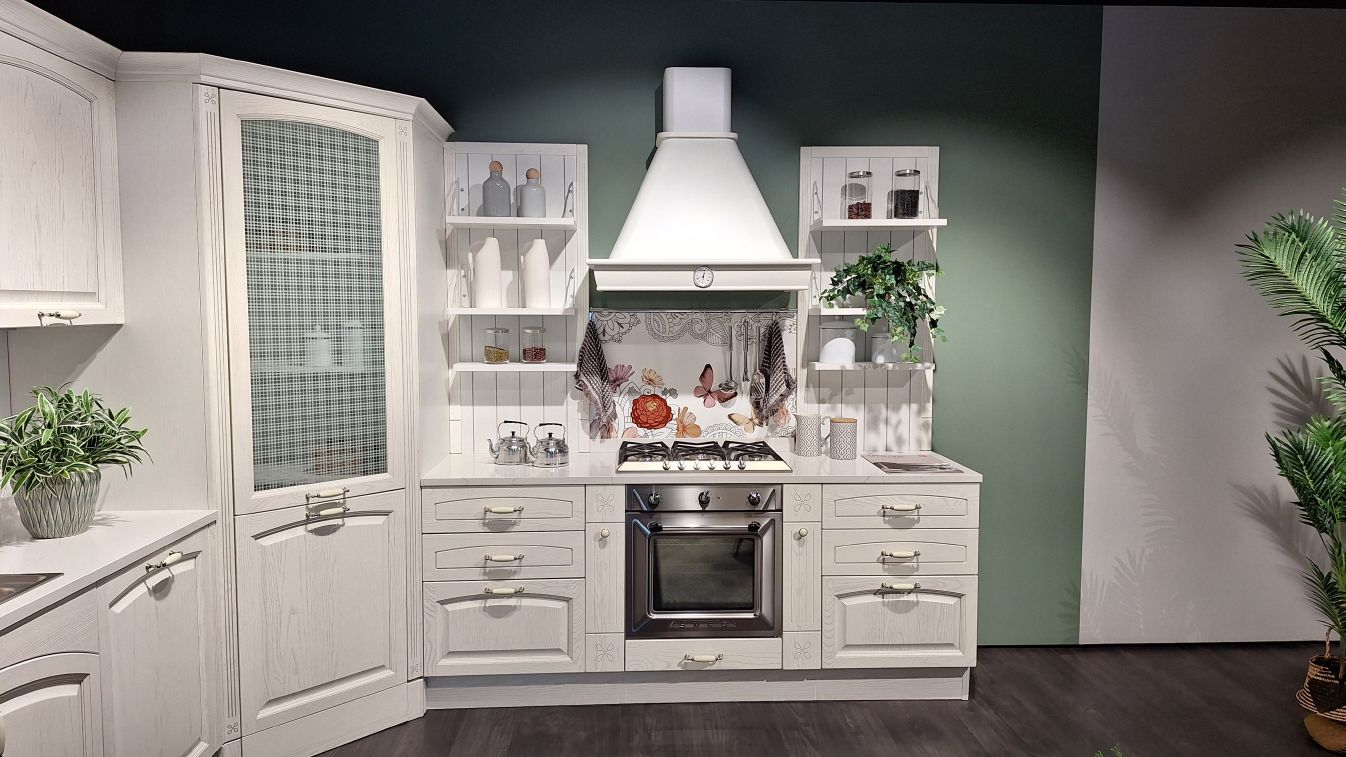 Un elemento distintivo sono gli schienali, che presentano una vivace fantasia floreale e di farfalle, aggiungendo un tocco di colore e personalità all’ambiente e creando un punto focale affascinante. La cappa a camino, in stile tradizionale, e le mensole a giorno contribuiscono a definire lo stile classico.