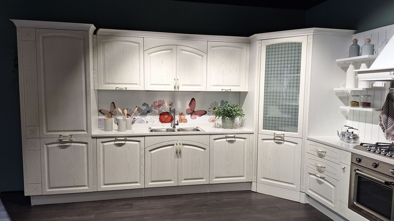 Cucina in offerta Febal Casa Gala classica ad angolo in legno naturale bianco decapè, top in quarzo spessore 3, kit elettrodomestici Smeg Victoria, schienali con fantasia.