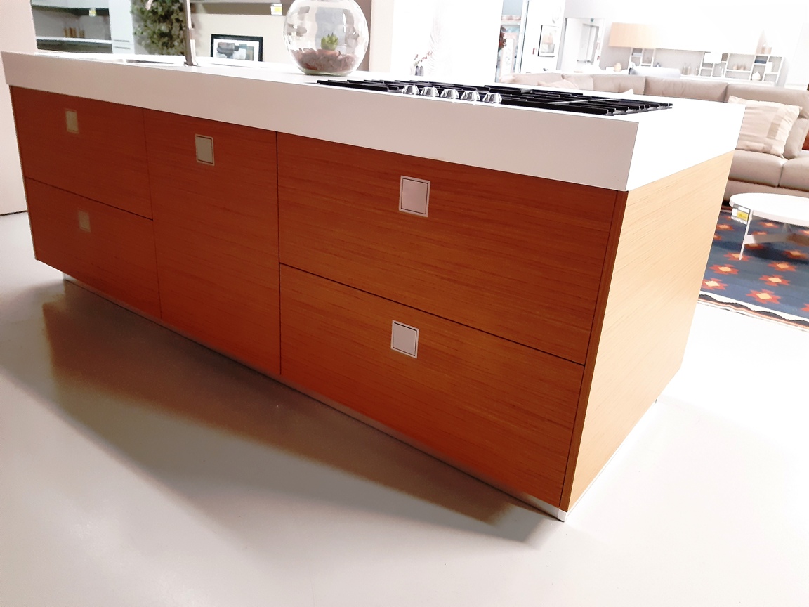 Cucina con isola modello Silverbox del noto marchio Ernestomeda realizzata in legno teak con piano di lavoro in unicolor bianco