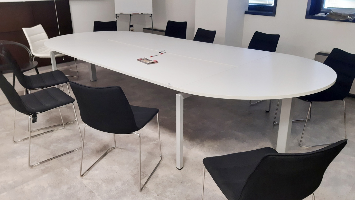 Sala Riunioni B3: grande tavolo 370x160cm in materico rovere bianco completo di sedie comode / poltroncine nere struttura cromo